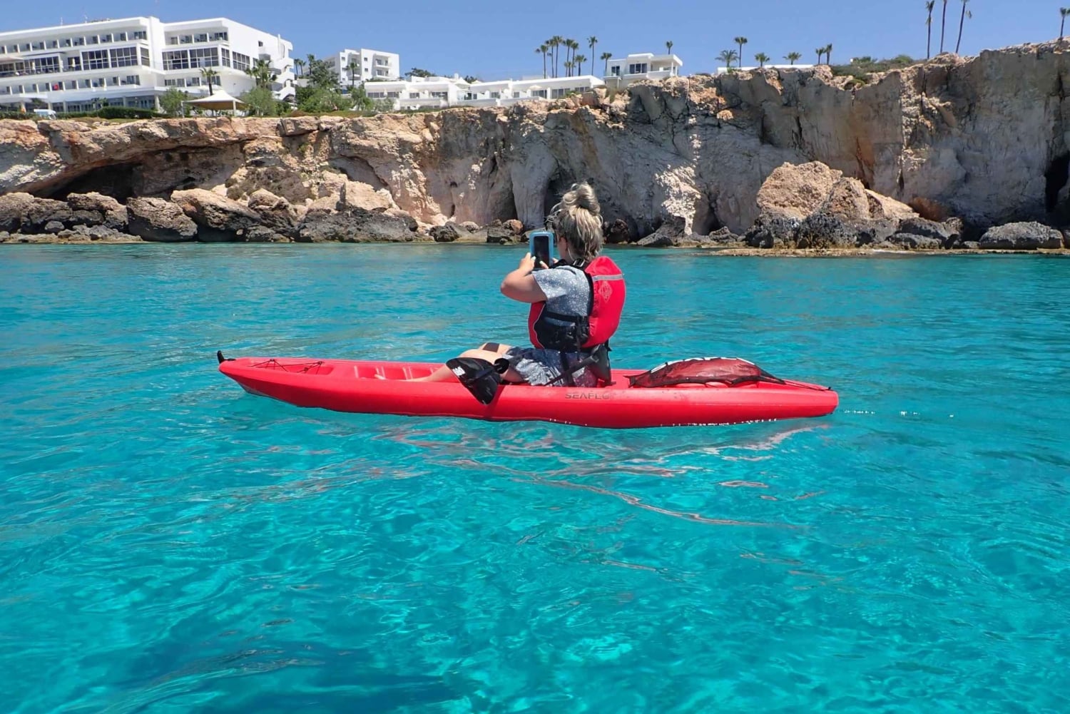 Udforsk det krystalklare vand ved Agia Napa i vores sitontop-rekreative kajakker på denne guidede tur. Kajak langs den klippefyldte kyst, opdag havgrotter, se den naturlige bue Lover's Bridge.