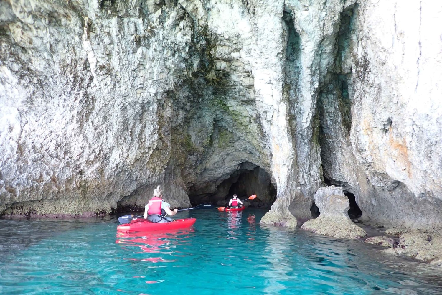 - Kajak med en guide langs en klippekyst med krystalklart, lyseblåt vand