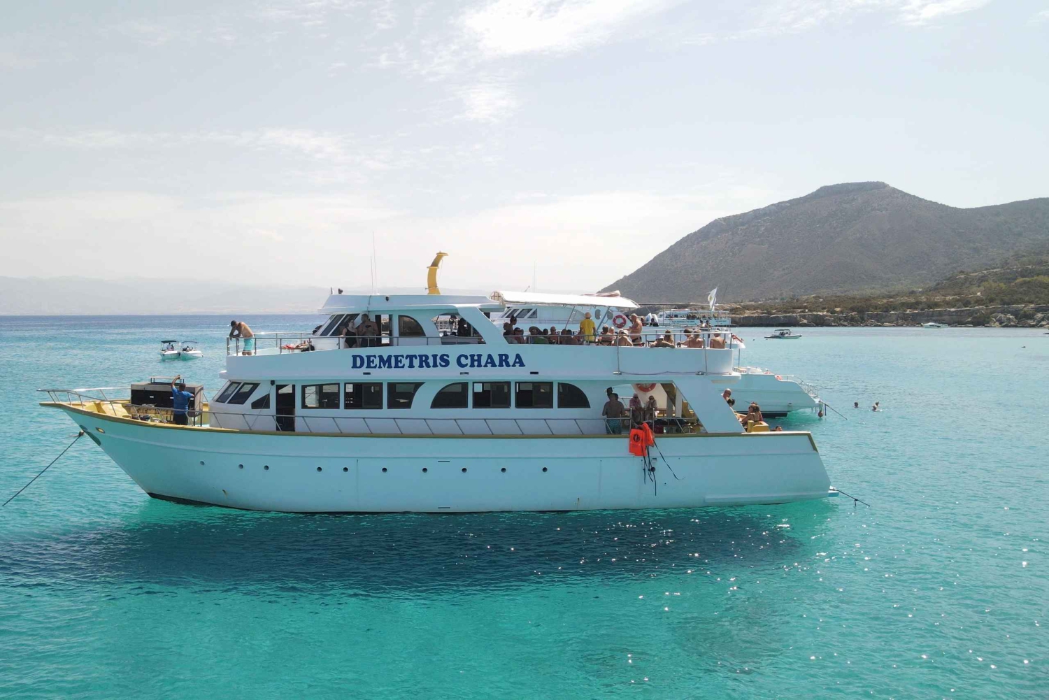 Begib dich auf eine entspannende Bootsfahrt mit Grill-Mittagessen und Abholung vom Hotel in Paphos. Genieße die atemberaubende Aussicht auf den Akamas-Wald und das kristallklare Wasser, während du zur Blauen Lagune fährst, um dort zu schwimmen.