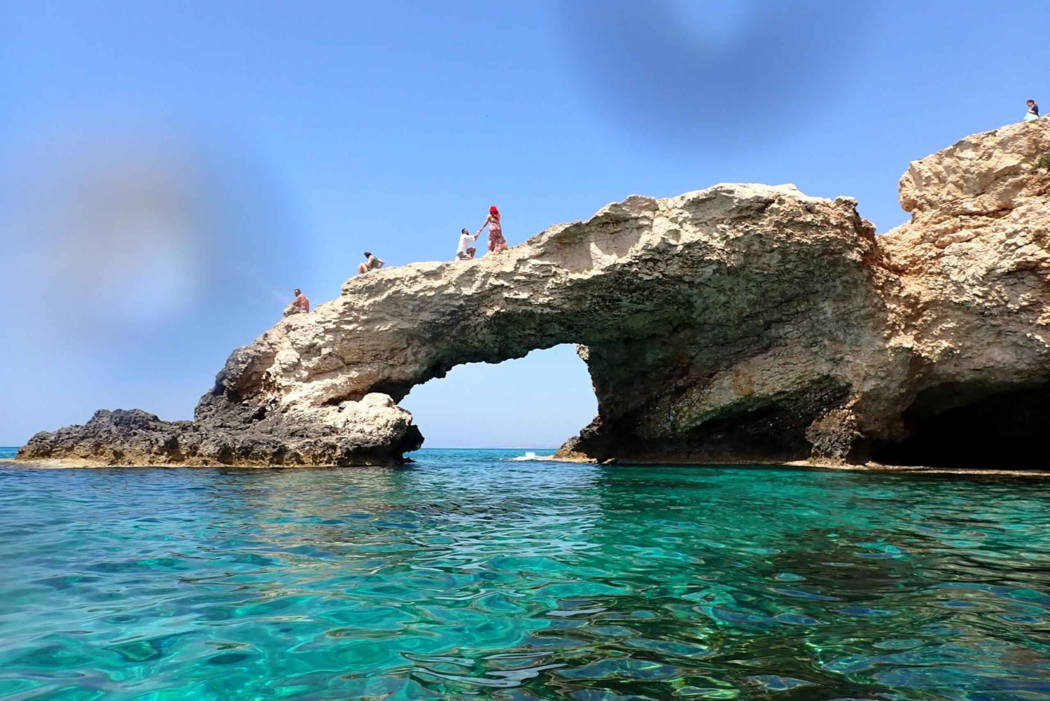 Los exploradores descubren el mundo en gran parte oculto de las cuevas marinas de Ayia Napa. El atractivo es el entorno paisajístico especial de las cuevas, tanto bajo el agua como sobre el nivel del mar. Normalmente entramos en dos cuevas, la «Cúpula» y la «Cueva Azul». También hacemos snorkel bajo el arco rocoso natural del Puente de los Enamorados.