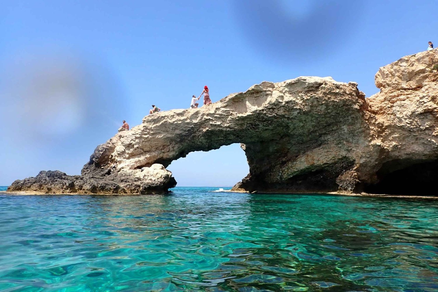 Explorers discover the largely hidden world of Ayia Napa Sea Caves. The attraction is the special scenic environment of the caves themselves, both underwater as well as above sea level. Usually we enter two caves, (the 'Dome' and the 'Blue Cave'). We also snorkel under Lovers' Bridge natural rocky arch.