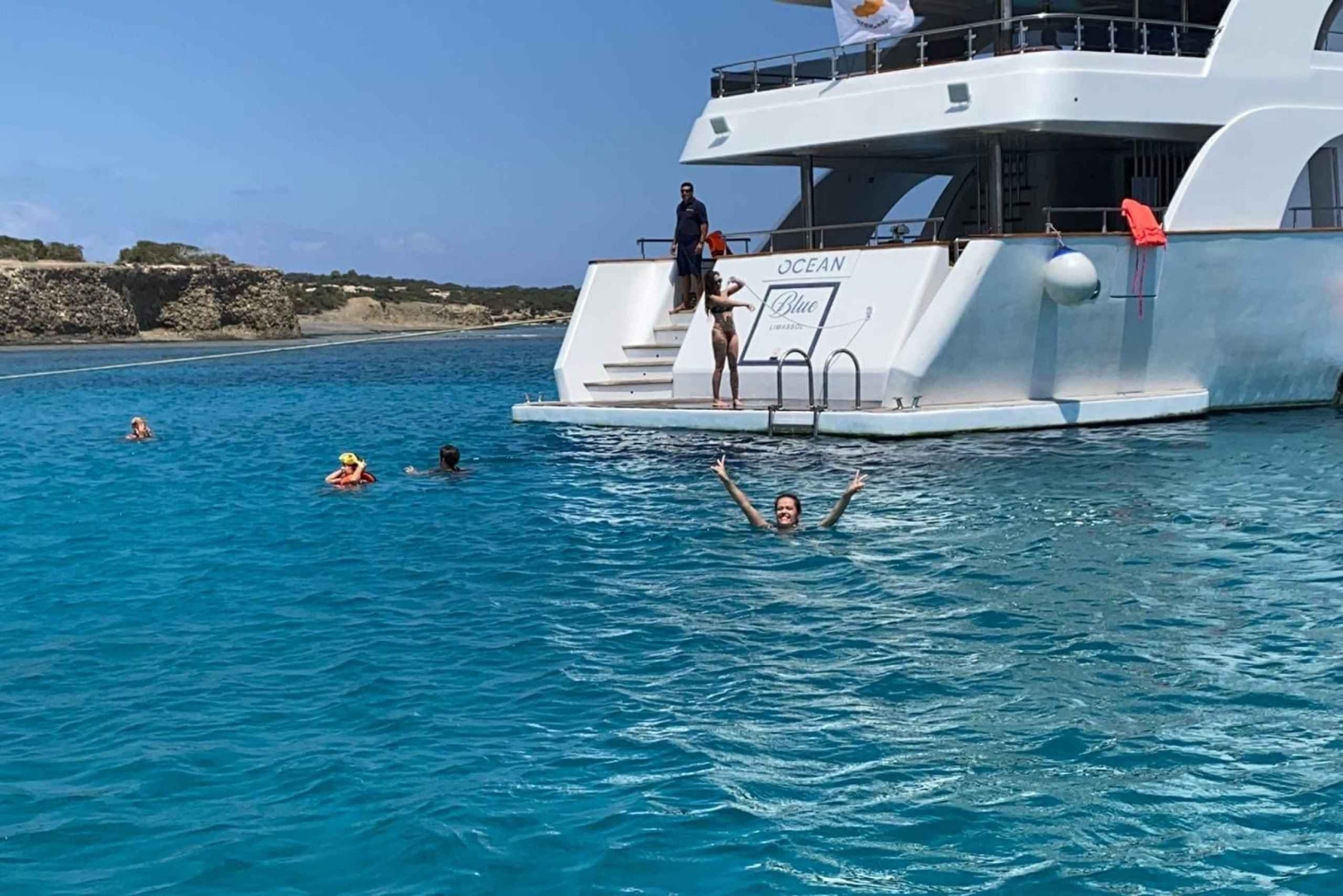 Koe ylellisyyden ruumiillistuma ilmaisilla kuljetuksillamme Pafoksesta Latchin satamaan, jossa aloitat upean matkan huipputeknisellä megajahdillamme. Lähdette viehättävästä Latchin satamasta, ja Välimeren kunnioitusta herättävä kauneus ympäröi teidät ohi legendaarisen Afroditen kylpylän, joka on rikas mytologian ja historian kohde. Matkamme jatkuu kuuluisalle Blue Lagoonille, joka tarjoaa täydellisen tilaisuuden nauttia virkistävästä uinnista koskemattomissa, taivaansinisissä vesissä. Tämä päivä on omistettu rentoutumiselle, nähtävyyksien katselulle ja auringossa paistattelemiselle, kun purjehdimme läpi yhden Kyproksen upeimmista alueista. Liity seuraamme ylellisyyden ja vapaa-ajan päivään, kun tarjoamme sinulle unohtumattoman retken pitkin Latchin lumoavaa rannikkoa.
