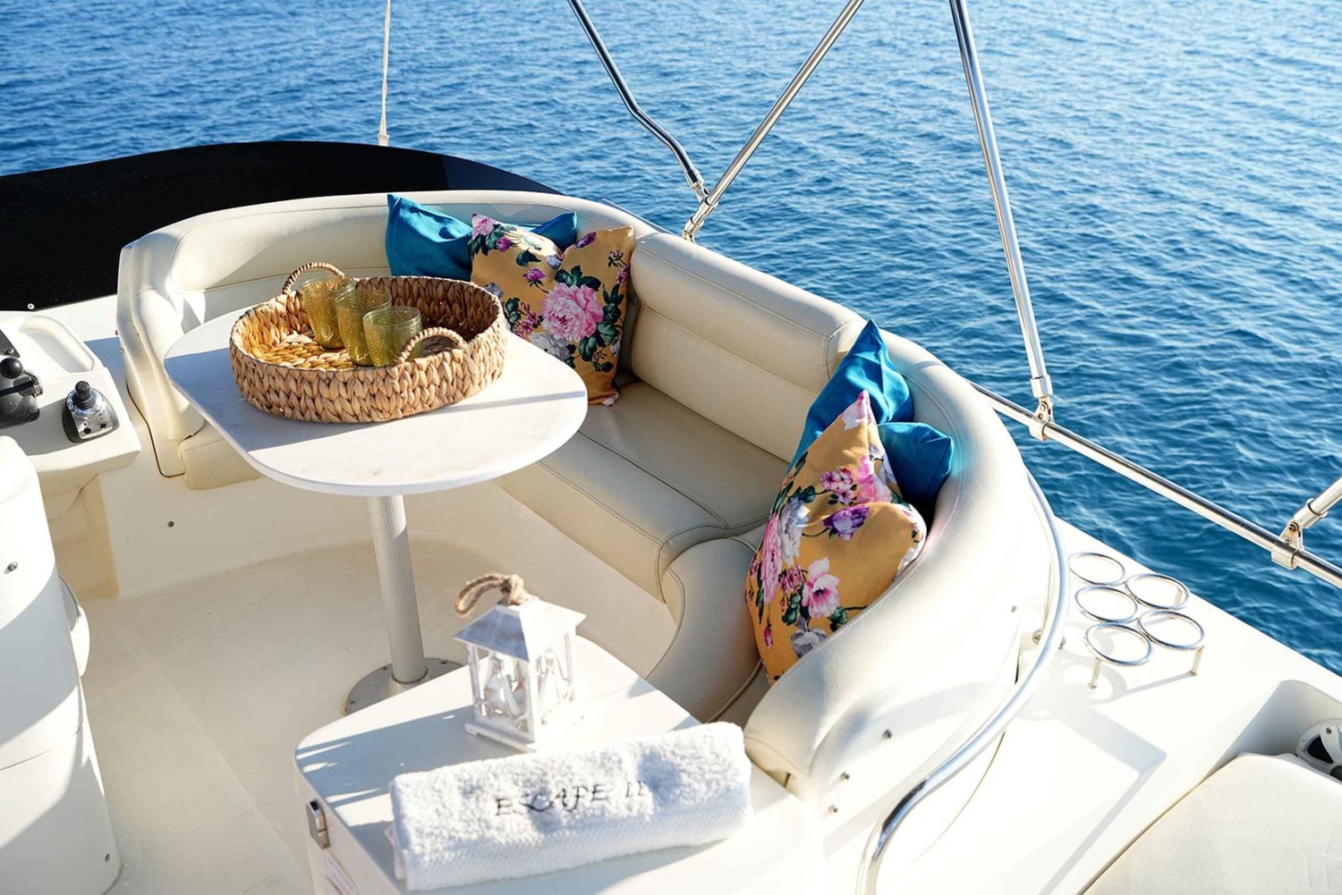 Escape II:n perässä on tarpeeksi tilaa lisäpöydälle ja istuimille ulkoruokailua varten. Paapuurin puolelta pääset helposti veneen keulassa olevalle auringonottoalueelle tai voit nousta tasoa ylemmäs nauttimaan 360 asteen panoraamanäkymistä veneen fly-bridgeltä.