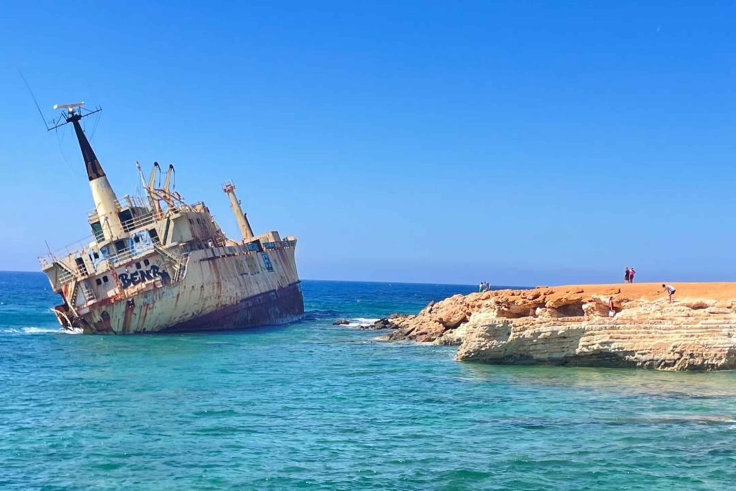 Prima tappa: il drammatico relitto della Edro III, arenato al largo di Peyia dopo una tempesta nel 2011. Il suo scafo arrugginito si appoggia alle rocce, risplendendo sotto il sole del Mediterraneo: uno spettacolo incredibilmente bello e l'occasione perfetta per una foto.
