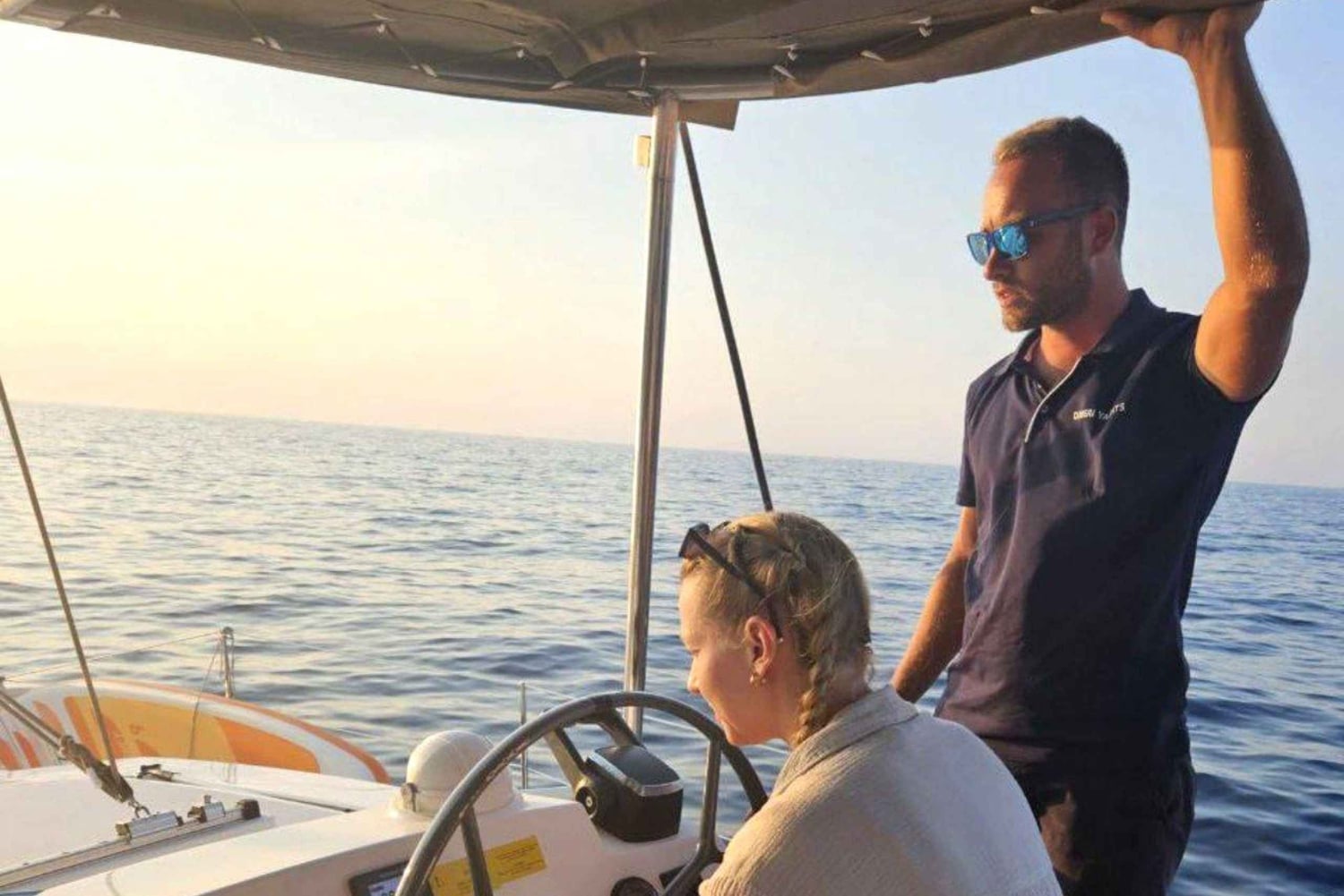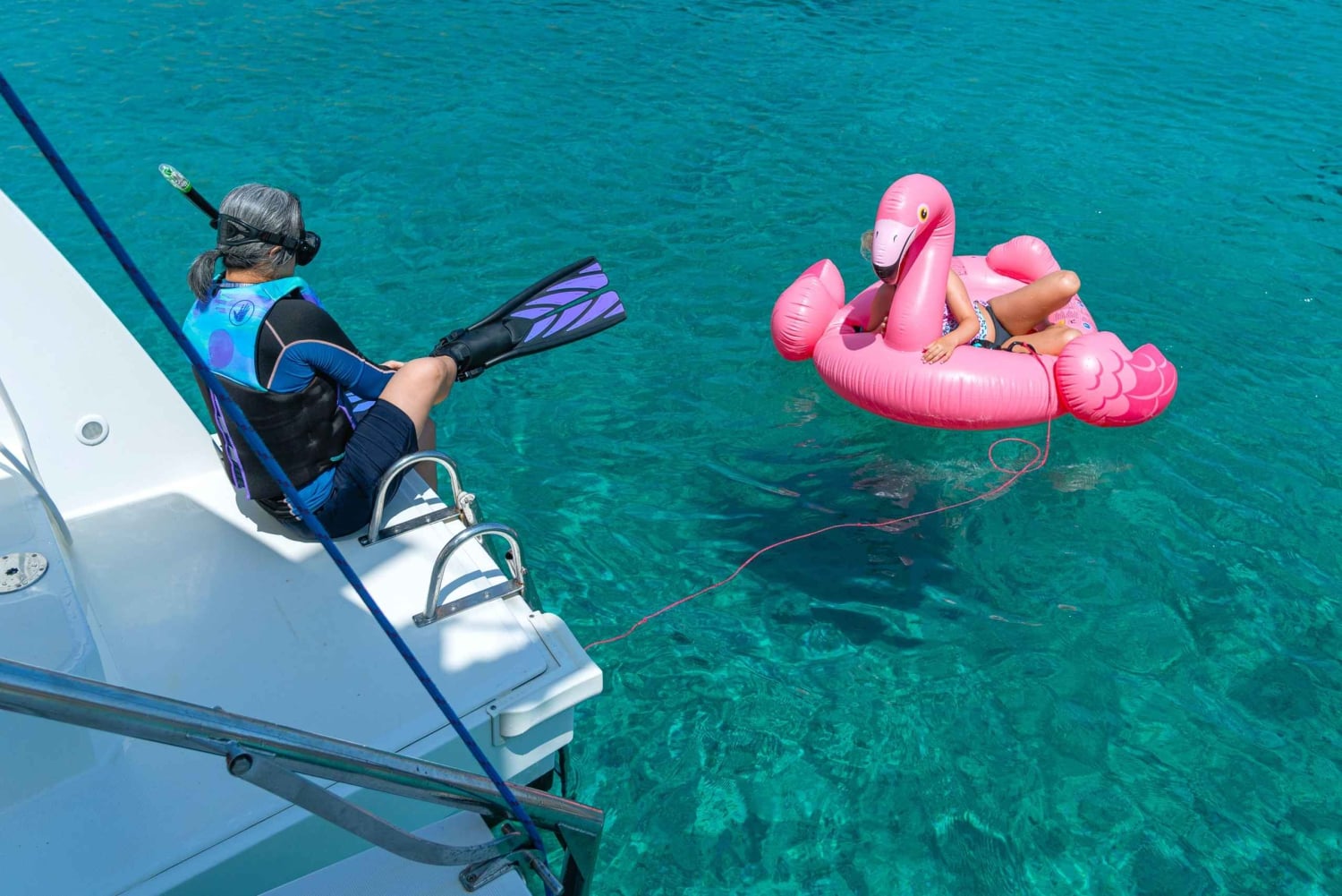 アヤナパからカボ・グレコ岬とブルーラグーンへの豪華なカタマランクルーズをご利用ください。水泳、シュノーケリング、グルメランチ、ドリンク、ウォーターアクティビティ、そして海に沈む美しい夕日をお楽しみください。