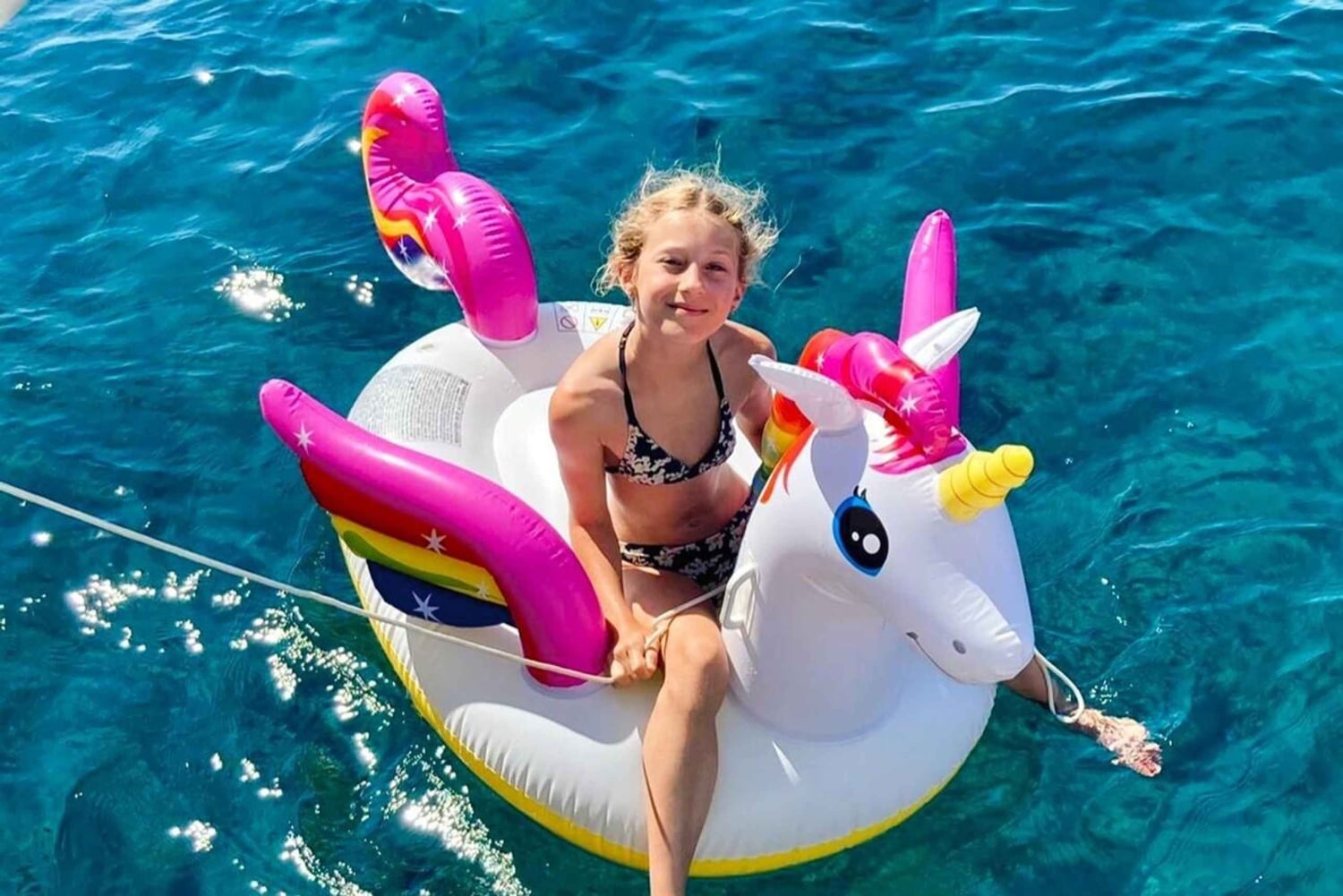 SUP、シュノーケリング用具、釣り用具など、水上アクティビティ用の用具をクルーが準備し終えましたら、透き通った海に飛び込んだり、パドルボードで海を滑ったり、キプロスの暖かい太陽を浴びながら、象徴的なピンクフラミンゴの浮き輪でリラックスしたりしていただけます。