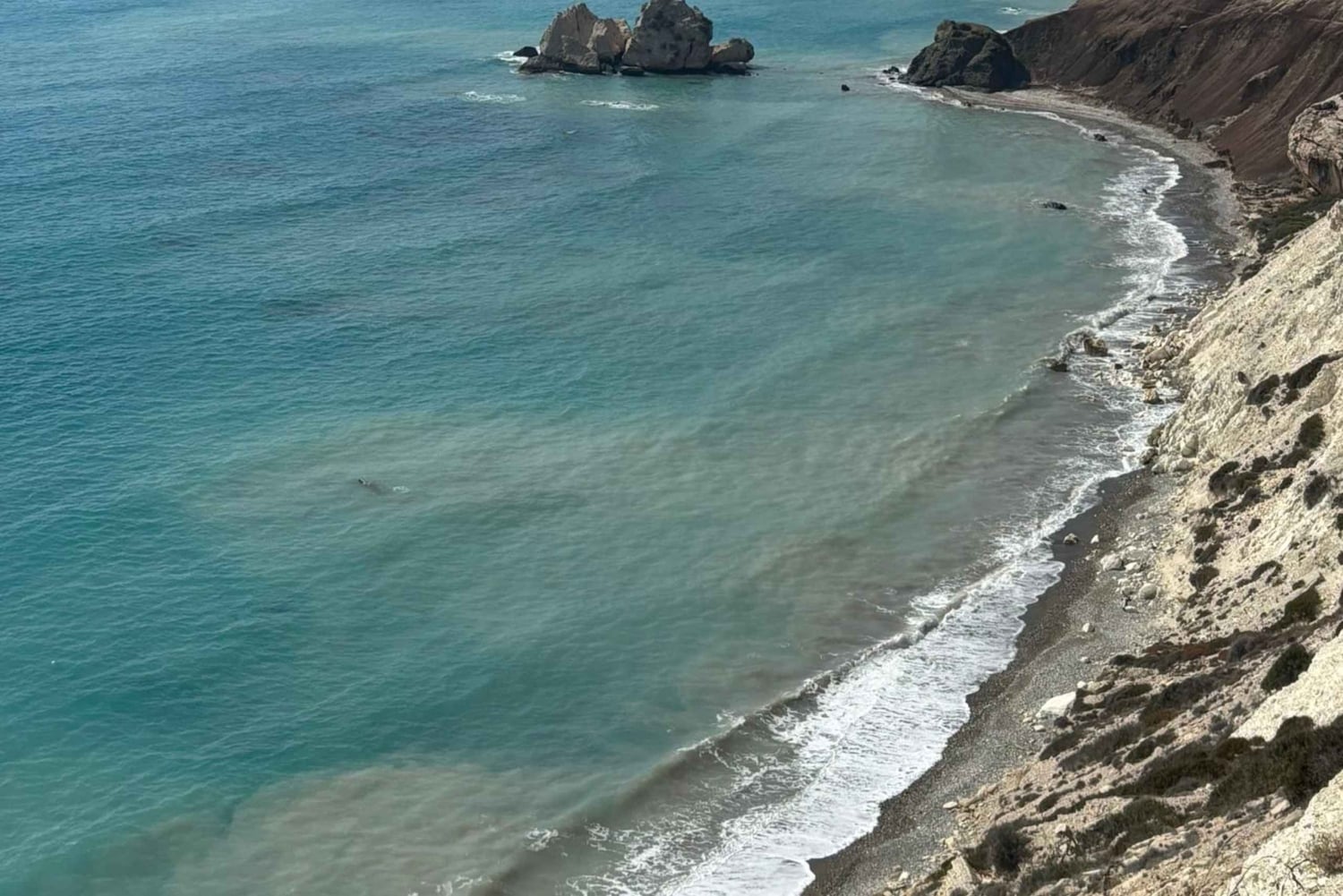 Avslutt på Afrodites strand (Petra tou Romiou), et av de mest ikoniske og mytologiske stedene på Kypros. Ifølge legenden er dette fødestedet til Afrodite, den greske gudinnen for kjærlighet og skjønnhet, som kom ut av sjøskummet på dette stedet. Den dramatiske kystlandskapet gjør det til et perfekt sted for bilder og refleksjon.