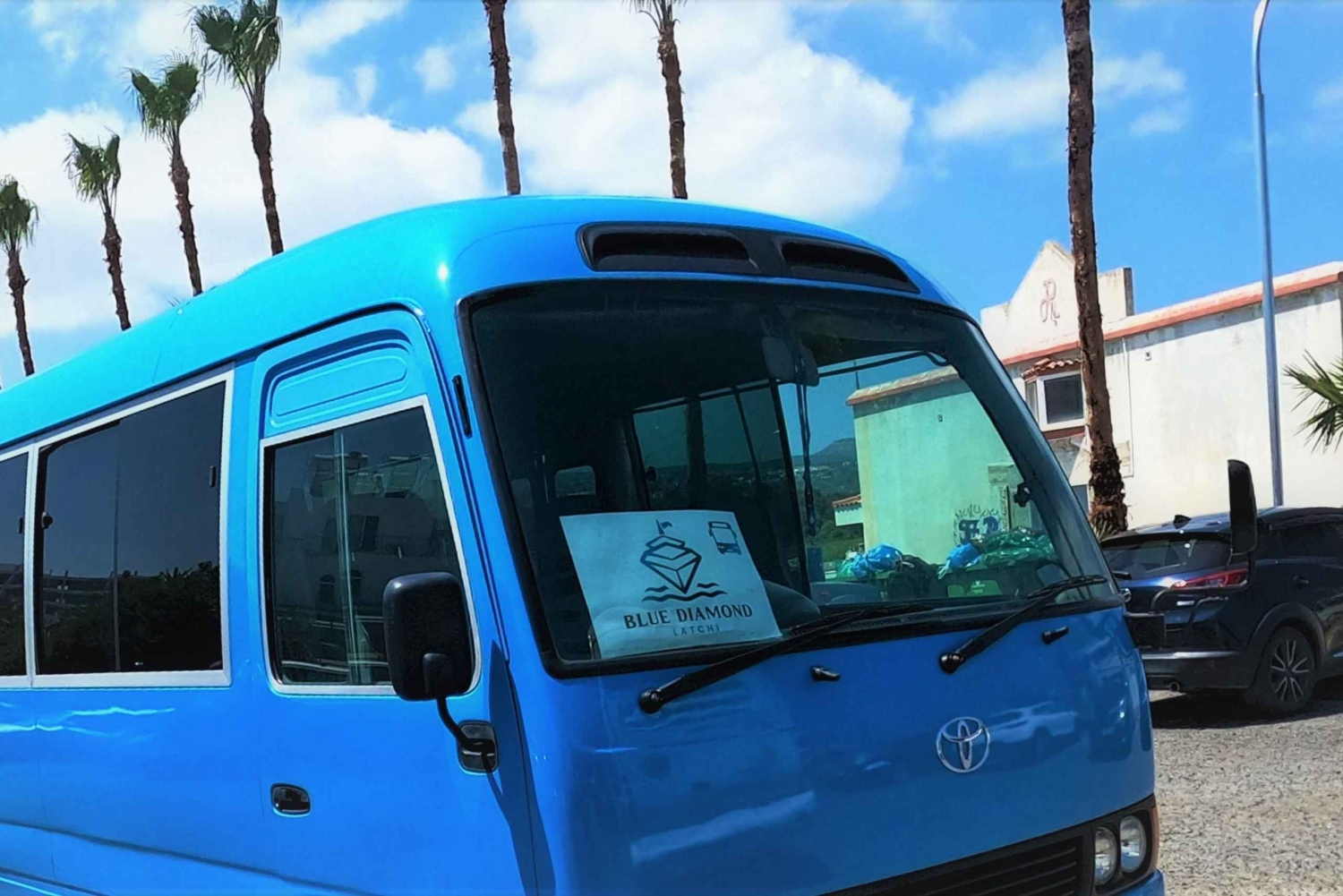 Para os hóspedes que viajam de Paphos com o nosso autocarro privado, oferecemos a conveniência de um autocarro totalmente climatizado com motorista profissional, garantindo uma viagem tranquila e sem stress até ao porto de Latchi, onde a tua viagem privada começa.