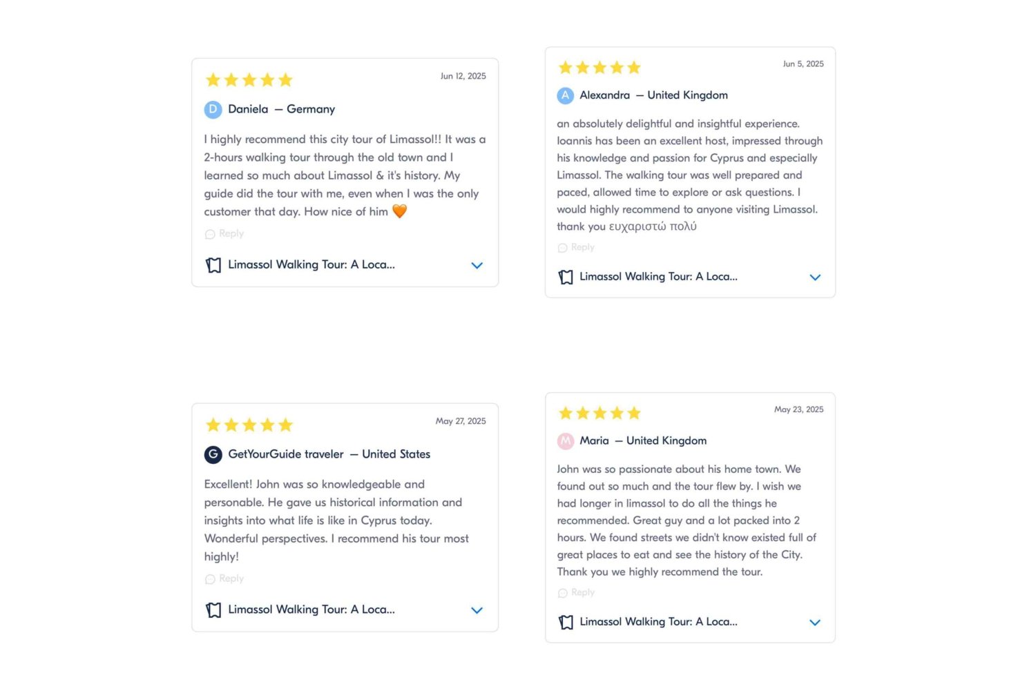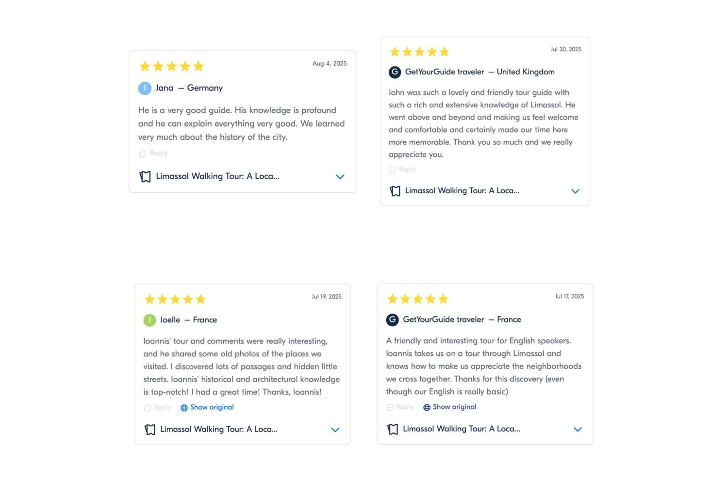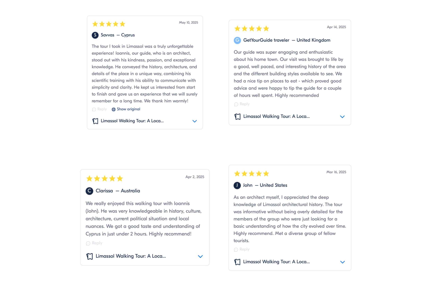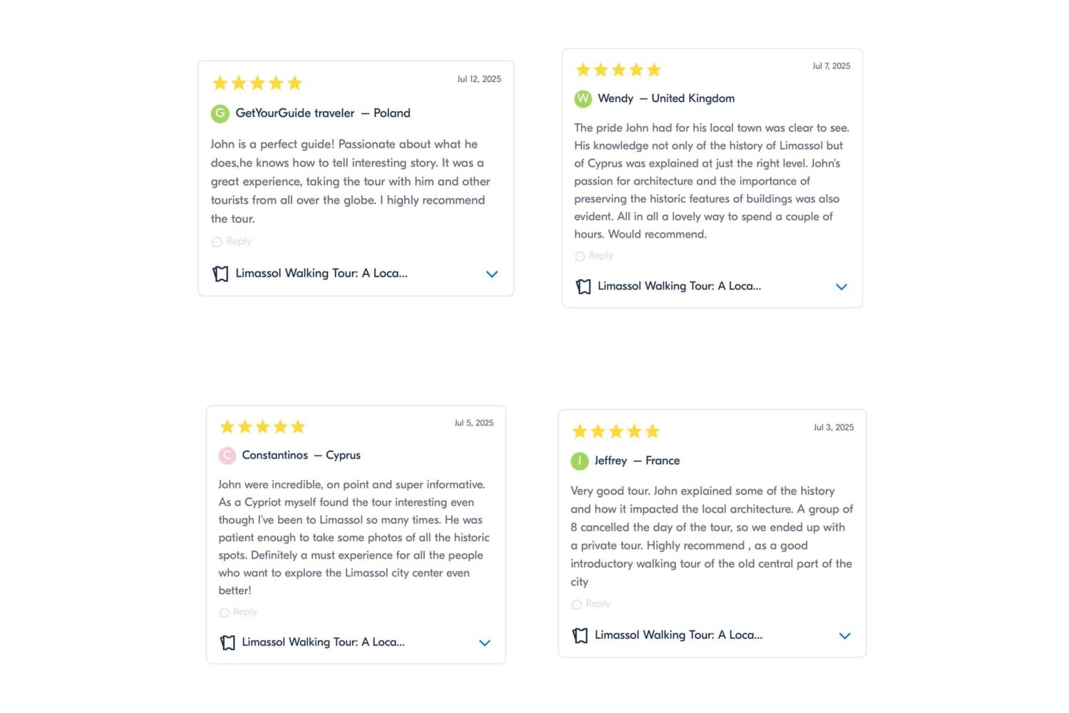 Погрузитесь в яркую историю Лимасола глазами местного архитектора. Исследуйте его богатую историю и скрытые сокровища, путешествуя по знаковым достопримечательностям от Замковой площади до Старого порта.