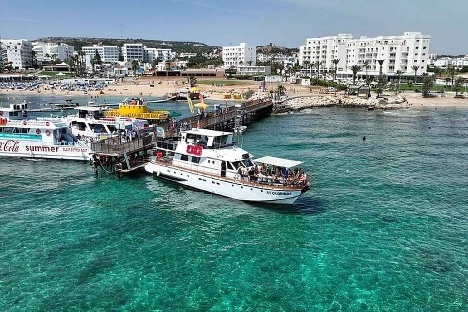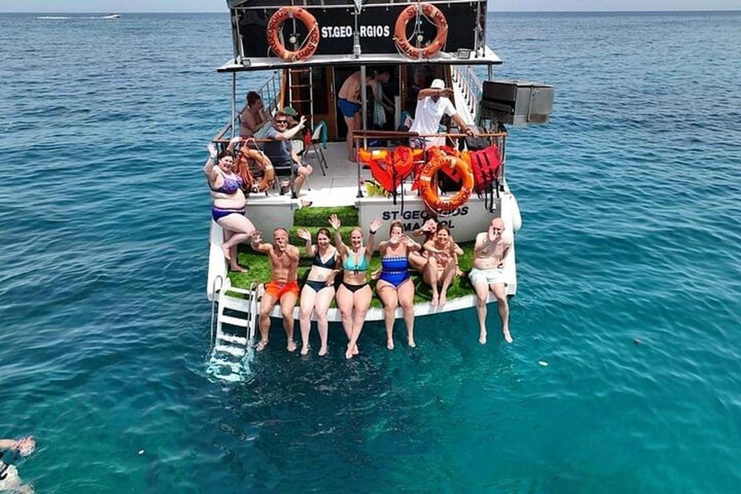 Step aboard St Georgios 1, once the private yacht of President Glafcos Clerides, Cyprus’s most beloved statesman. From the first cast-off, on this adults only departure, sunlight flashes across original period details—polished rails, classic fittings, and the captain’s instruments—while the sea breeze delivers that instant “holiday has begun” feeling. Find your rhythm on the Relax Deck, where the coast unfurls in wide, cinematic sweeps, or slip into the cool, air-conditioned lounge framed by picture-window sea views. Up front, the Captain’s Table—once a hub for conversation and counsel—now becomes the heart of your voyage: part story circle, part lookout. Cruise north as the silhouette of Famagusta rises and with it Varosha, the legendary “ghost town.” The scene is a compelling chapter in Cyprus’s modern story, echoing Clerides’s lifelong push for dialogue and reconciliation—even as the mood on board stays light and buoyant against a glittering horizon. Turn south and the coastline becomes a postcard slideshow: Fig Tree Bay’s golden arc, Cape Greco’s cliffs, the whitewashed Agioi Anargyri Chapel, and the elegant span of Lovers Bridge. Cameras work overtime; every angle is a keeper. At the Blue Lagoon, anchor in turquoise water so vivid it looks edited. Leap from the platform, whoosh down the slide, snorkel with darting fish, or simply float and let the sun do its thing. The crew’s warmth—and a little of Clerides’s spirit of hospitality—fills the water. Enjoy a lunch of freshly grilled chicken, homemade chips, Cyprus couscous, pasta, crisp salad, and garlicky tzatziki. Vegetarian? You’re covered with items from our selection available. The bar hums all day with cold drinks and light bites. Don't forget you have a cocktail or beer included in the price. On the homeward glide, Turtle Bay often delivers a final thrill—green sea turtles surfacing beside the hull to choruses of delighted shouts. As Protaras draws near, the late-afternoon light turns the sea to molten gold, and St Georgios 1’s storied silhouette feels especially timeless.