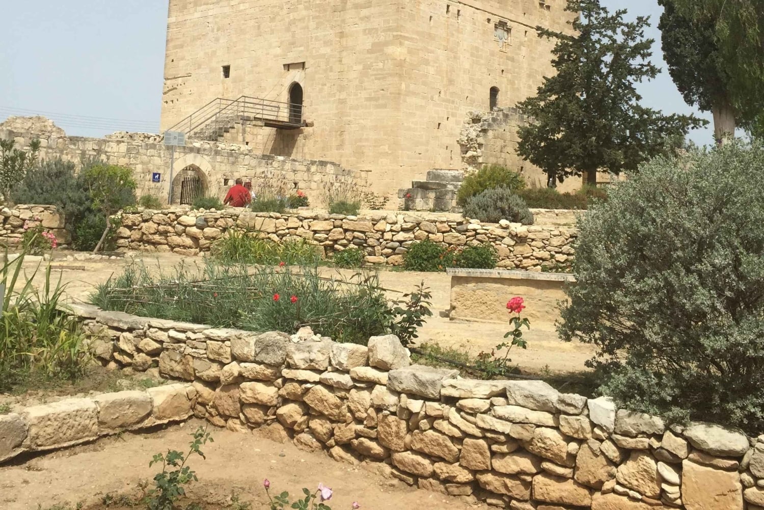 В Лимасоле посетите средневековую крепость, построенную в XIII веке Лузиньянами на руинах византийской крепости, где в 1191 году состоялась знаменитая свадьба Ричарда Львиное Сердце и Беренгары Наваррской. В настоящее время здесь находится Средневековый музей Кипра. Экскурсия продолжается в окрестностях, через район, состоящий из интересных восстановленных складов, превращенных в рестораны и выставочные залы, и ведет к старому порту Лимассола.
