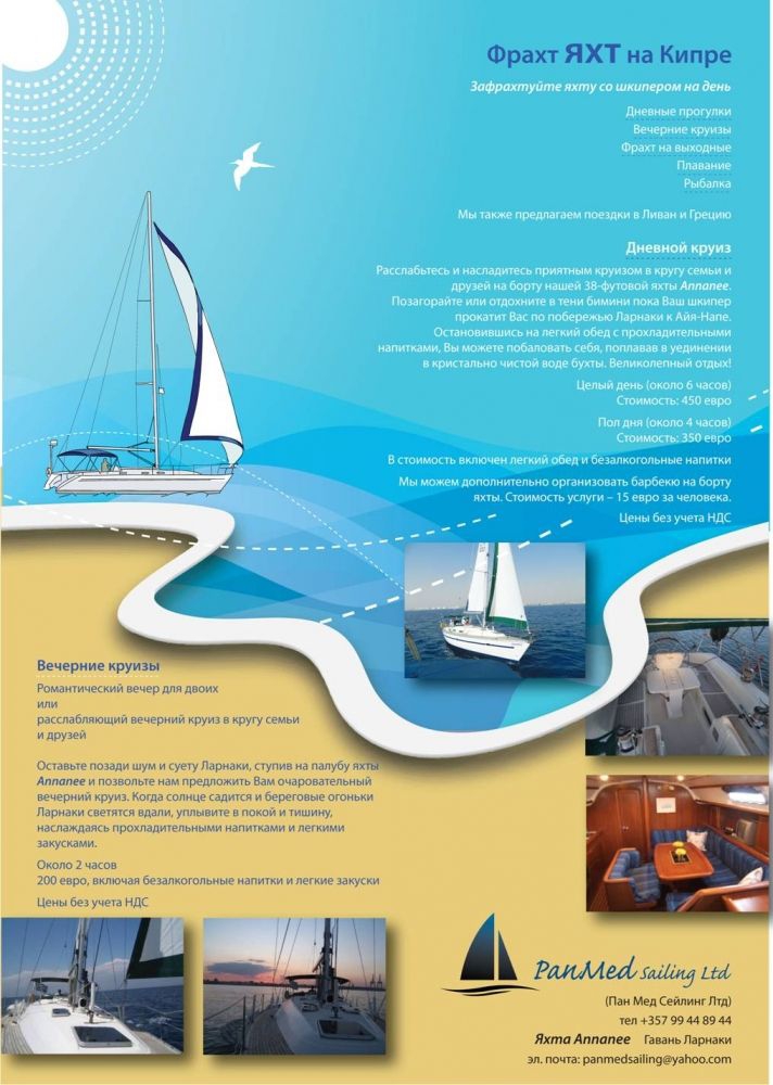 För många människor, både boende och besökare, är en av de stora sakerna att njuta av på Cypern spänningen med segling. PanMed Sailing är baserat i Larnaca Marina och erbjuder dig chansen att tillbringa tid ombord på en vacker privatchartrad yacht med sin högkvalificerade skeppare som gladeligen kommer att guida och råda dig om grunderna i denna populära sport. Att chartra en yacht är det perfekta sättet att skapa en oförglömlig upplevelse för den speciella personen, nära familjen, vänner eller kollegorna och är ett utmärkt sätt att fira en speciell tillställning eller helt enkelt säga 'Jag älskar dig'.