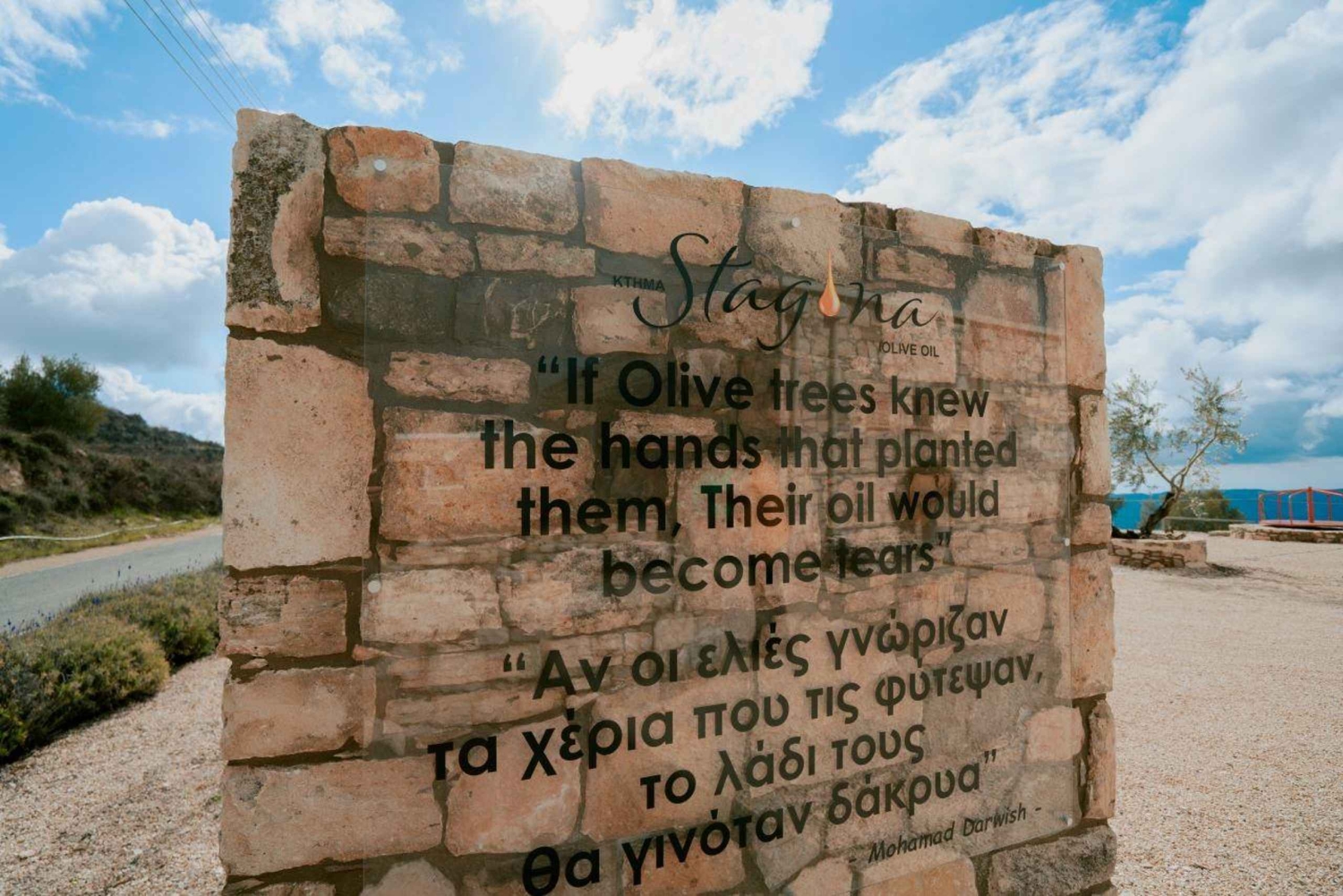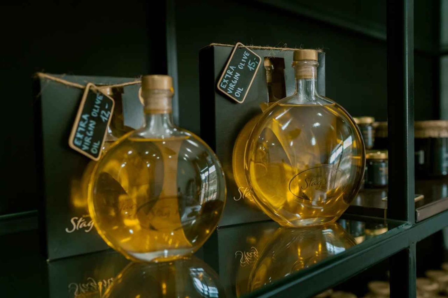 Därefter besöker vi Stagona Olive Oil Farm, där du kan utforska olivlundarna och se hur oliver pressas till flytande guld. En guidad provsmakning avslöjar smakerna och aromerna av nyproducerad extra jungfruolja, olivsylt och olivpasta – en riktig medelhavsskatt.